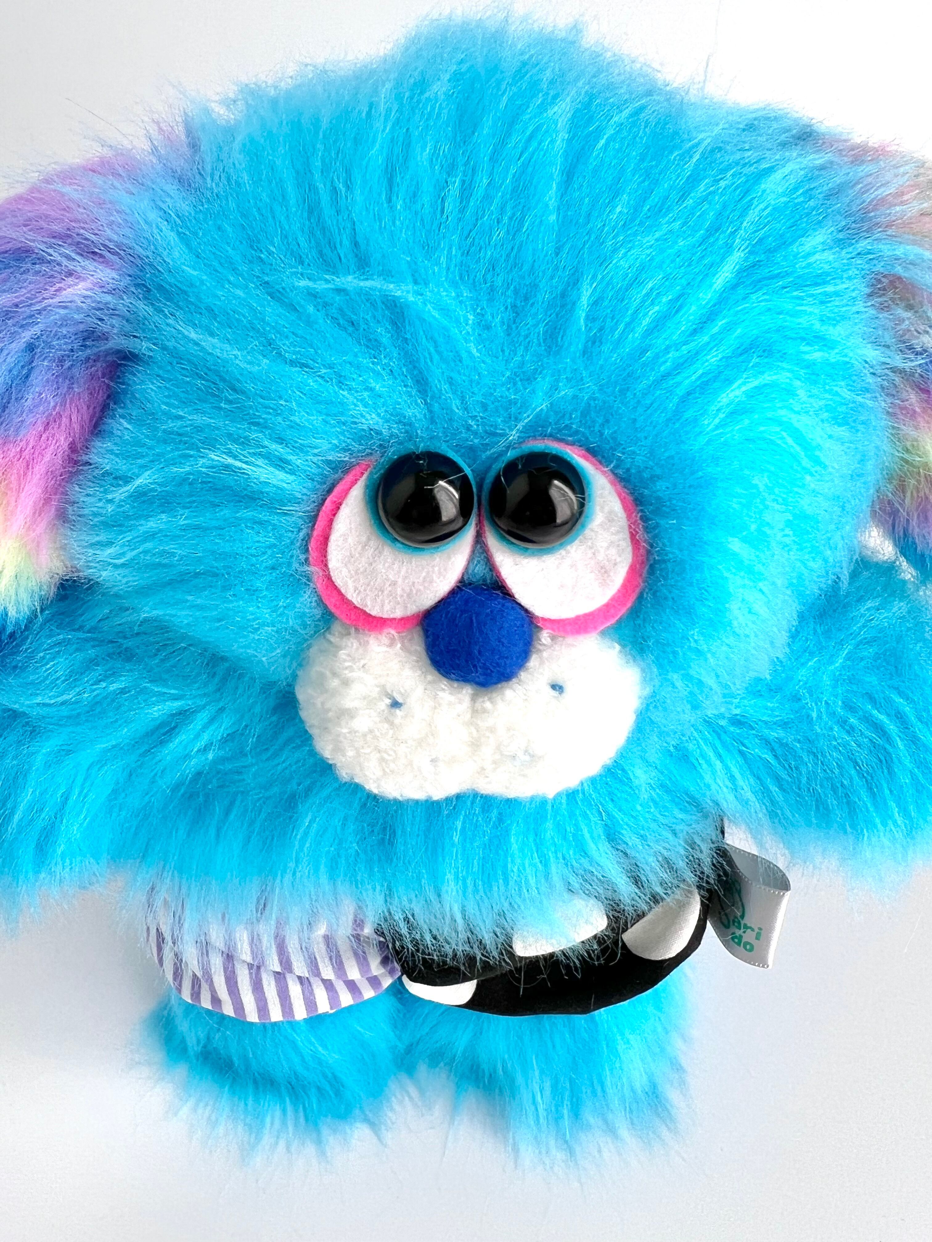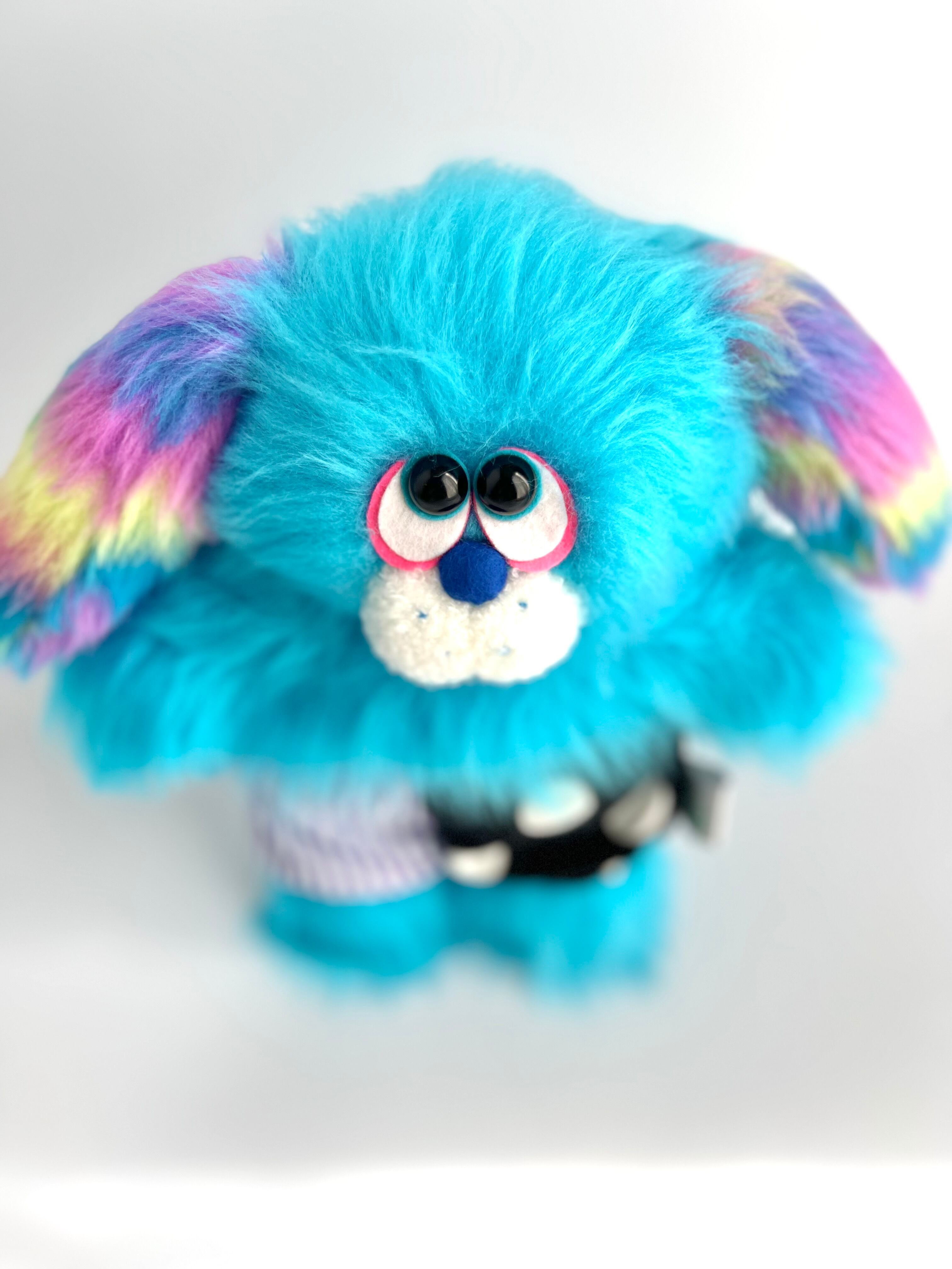 爽やかなライトブルーのふわふわボディとレインボーマーブルのお耳が特徴のポップなわんちゃんです。